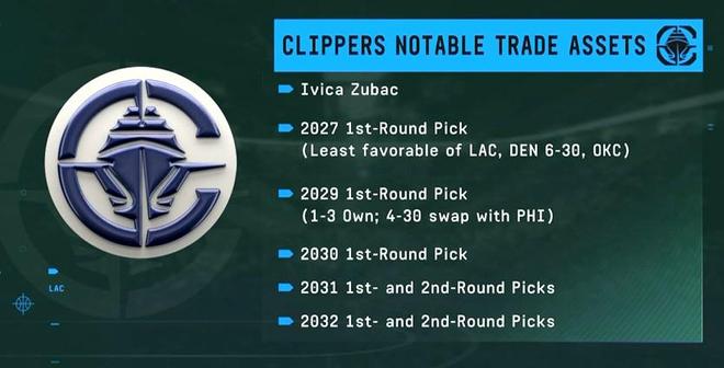 比赛直播期间,当地转播方列出了快船队目前拥有的重要交易筹码。除了球员方面祖巴茨被视为可交易的重要资产之外,快船队的选秀权资产“少得可怜”:直到2030年,快船队才拥有一个自己的完整的首轮。2026年和2028年的首轮都已经完全交易出去,2027年(快船、掘金6-30顺位和雷霆三个首轮中顺位最低的)和2029年(1-3顺位可保留,否则归76人)将根据条件获取首轮。